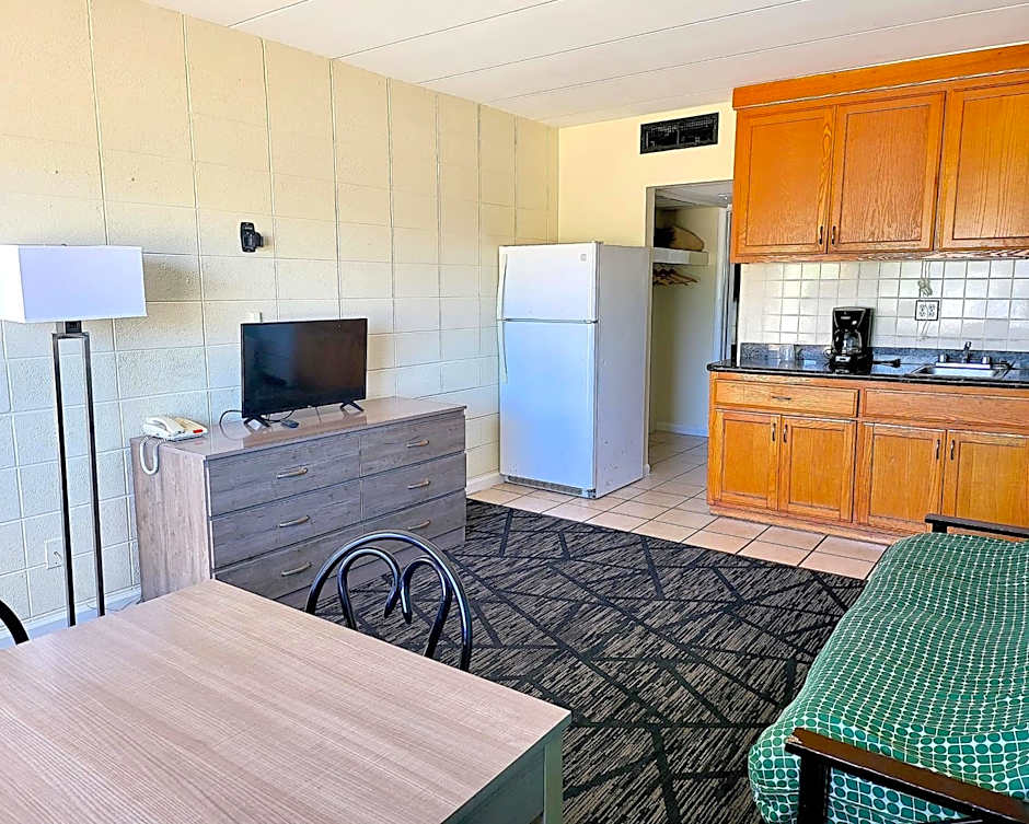 This room features a flat-screen cable TV, microwave and refrigerator.